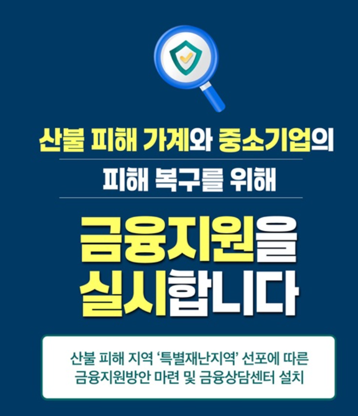 이에 따라 정부는 피해 지역을 '특별재난지역'으로 선포하고 금융지원 대책을 마련하였습니다. 피해를 입은 주민과 사업자는 다양한 금융지원 내용을 확인하시고, 즉시 신청하시기 바랍니다.